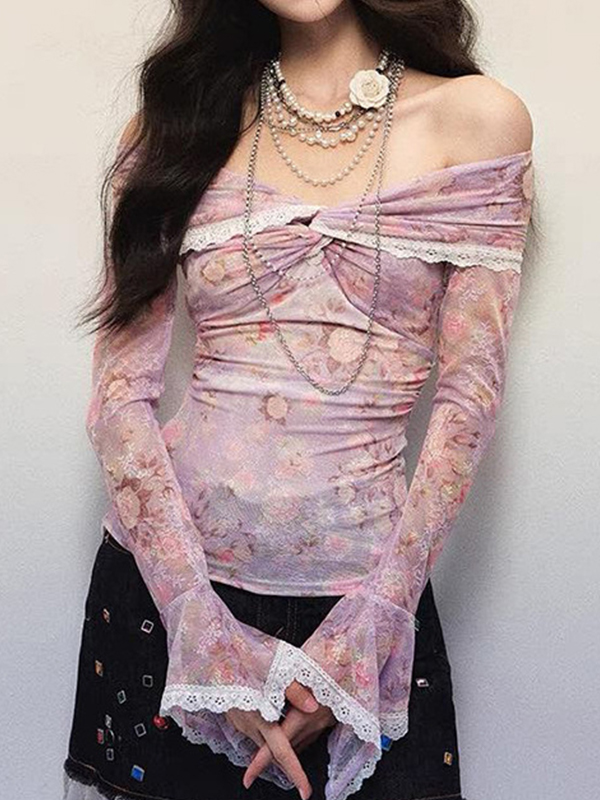 Langarm-T-Shirt mit Blumenmuster und einer Schulter