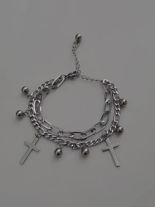 Doppellagiges Armband mit Kreuzanhänger und Perlenkette