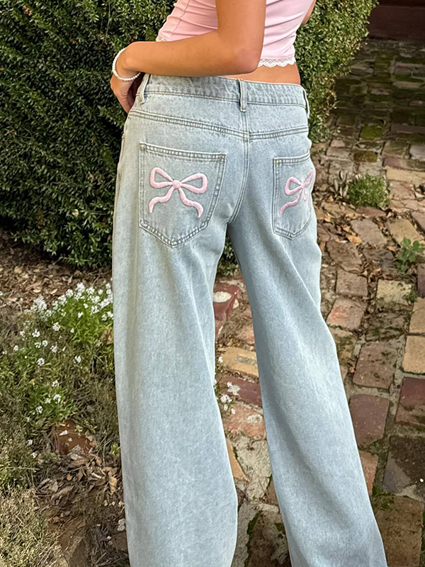 Rosa Boyfriendjeans mit Schleife und bestickter Gesäßtasche