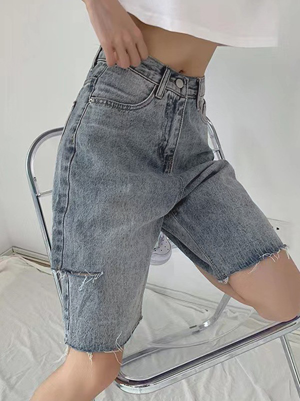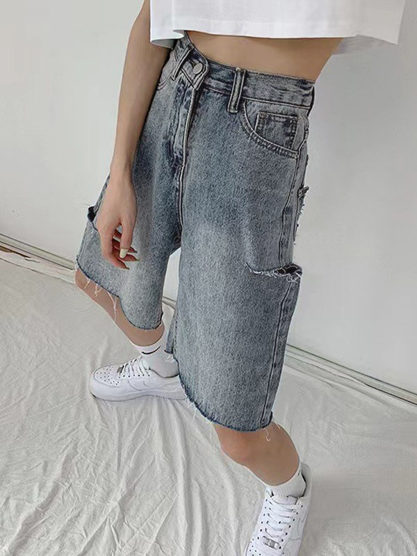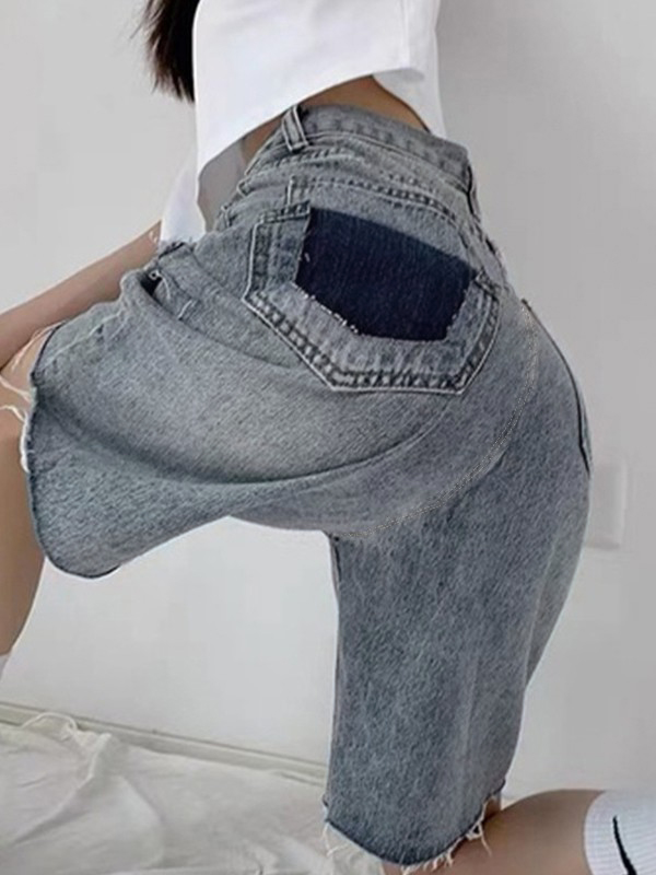 Stil: Casual/Street/Vintage/Basics Material: Baumwollmischung Passform: Normale Passform Design: Diese unverzichtbaren Jeansshorts haben eine gerade Beinpassform, sitzen in einer hohen Silhouette, sind mittellang und haben einen unversäuberten Saum. funktionales Taschendesign und ein Reißverschlussknopfverschluss.