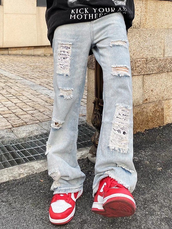 Boyfriendjeans mit weitem Bein und Totenkopf-Print im Vintage-Stil in Blau
