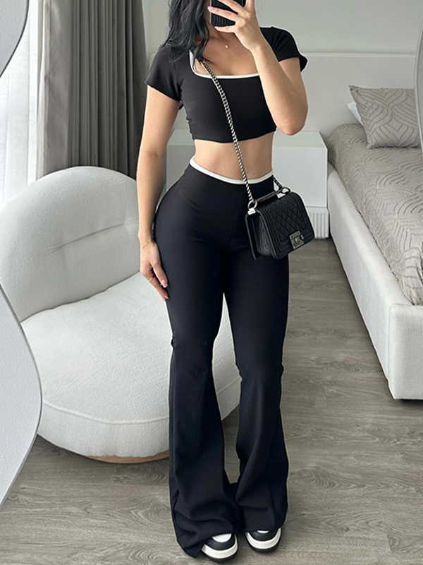 Set aus einfarbigem, verkürztem, schmalem Langarm-T-Shirt und ausgestellter Jogginghose